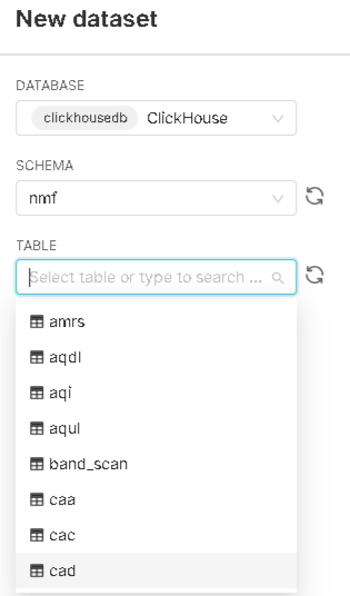 Выбрать необходимые поля: database, schema, table, создать набор данных и перейти к созданию визуализации: «Create dataset and create chart»